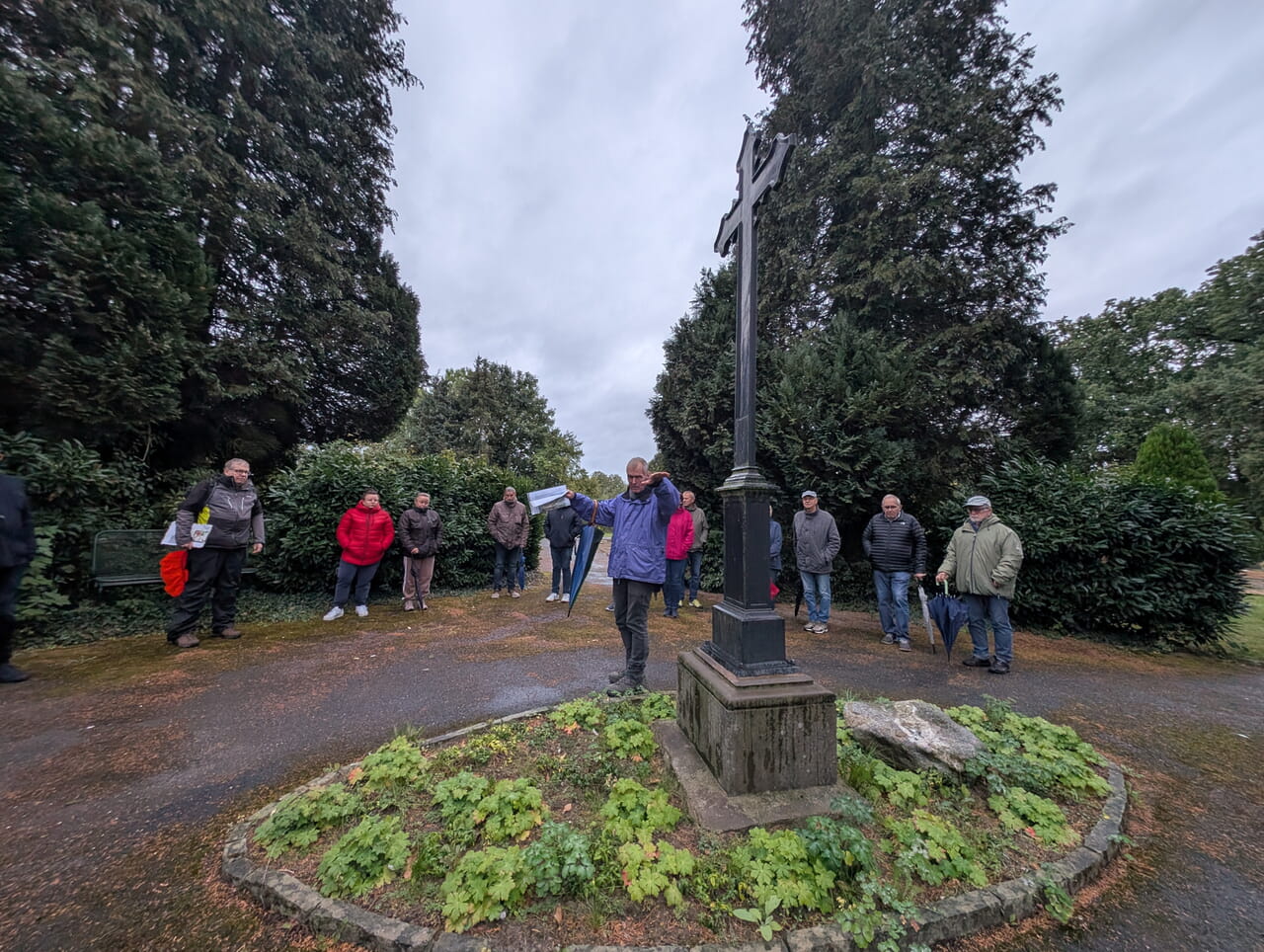 Ganz anders die Ecke ganz hinten, wo einige kaputte Nadelbäume ihr Dasein fristen, die Laubbäumen weichen sollen. Dahinter soll ein kleiner Teich mit recycelbarer Teichfolie, „die füllen wir einmal auf, aber von da an erledigt der Regen das“, so Berger. Baumbestattungen sollen Einzug halten auf dem Friedhof, ebenso ein Kolumbarium, das bewusst so gestaltet werden soll, dass sich Bewuchs bilden kann. Der mittige Platz rund um das große Kreuz soll geweitet werden durch Entfernung des Kirschlorbeers und Ersatz durch eine immergrüne Mahonien-Hecke, deren Blüte zu „Insekten-Partys“ einlade.