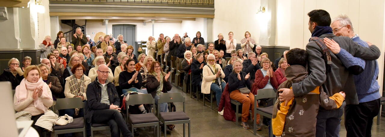 Stehende Ovationen für Musik und Texte und die Rufe nach einer Zugabe, waren das Brot des Künstlers. Für die bat Aeham Ahmad seinen Sohn Kinan an das Klavier, der zeigte, dass er gewillt ist, dem Vater in die musikalischen Fußstapfen zu folgen. „Es ist schwierig, Worte zu finden“, leitete der Vorsitzende des Fördervereins, Wolfang Faber, seinen Dank an den Künstler und Pfarrer Arnoldi für die Lesungen ein. „Wir sollten auch nicht vergessen, dass die Leute, die da als Flüchtlinge kommen, Menschen sind“, mahnte Faber, und der Applaus der Anwesenden war ihm sicher.