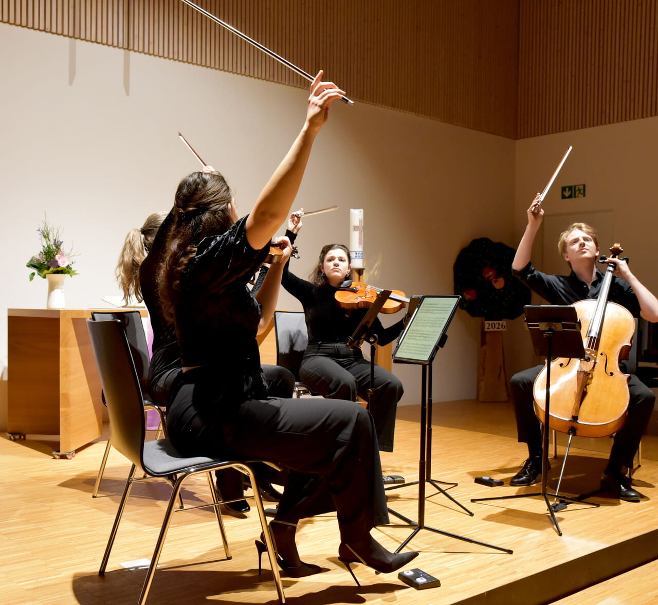 Nach wenigen Minuten kehrten die Musiker:innen mit „reparierter“ Geige zurück und setzten das Konzert fort, als wäre nichts gewesen. Während die Musik von Beethoven von der Verzweiflung über den Verlust des Gehörs geprägt war, überzeugte das Quartett sein Publikum mit einem vollends engagierten Zusammenspiel, das mit besonderer Impulsivität dafür sorgte, dass auch die Geigenbögen „Federn lassen“ mussten.